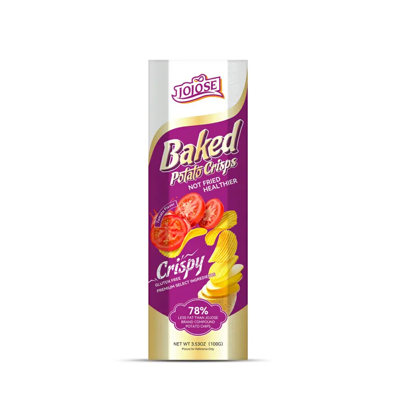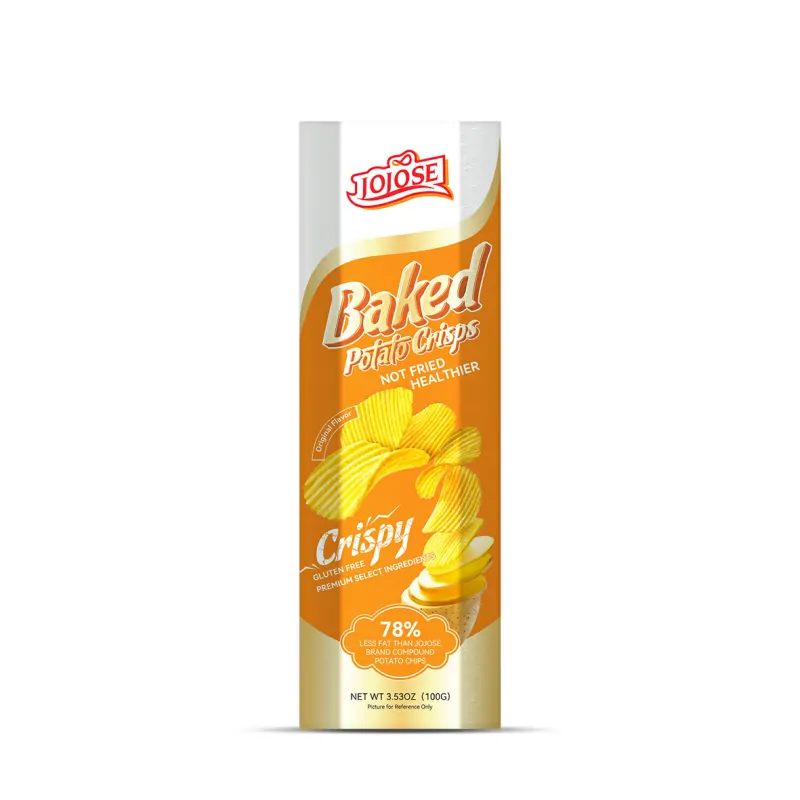 The new type baked potato chips is baked in the oven until they are crispy and crunchy and topping them with dressing. Baked potato chips has lower fat content, more moisture, with lower oil temperature during drying, and do not use multiple oils, so that baked potato chips has lower calories than another 2 types potato chips, and the loss of nutrients is relatively small, which is harmful Substance content is low. The popular brand of this baked potato chips is Orion brand from Korea. Jojose Foods is copying the taste & packing of Orion brand, with a better price!